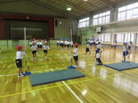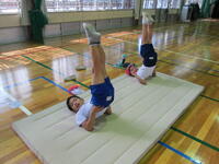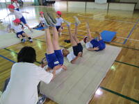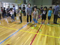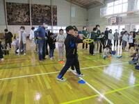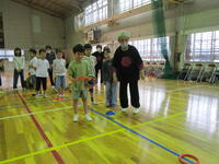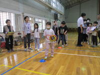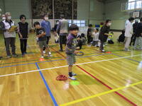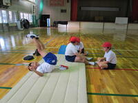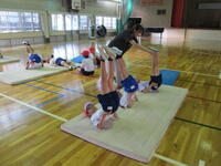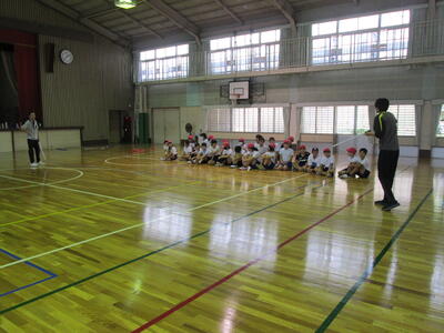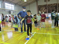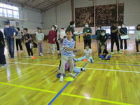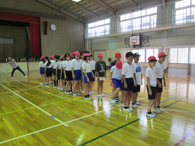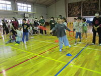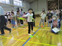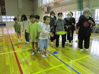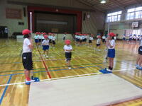 跳びあそびの学習をしています。ちょうど国語では「くじらぐも」の学習をしています。お話の中で1年生、「50センチぐらい」ジャンプをしていましたね。みんなも50センチ跳び越えることができるかな?