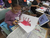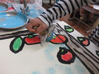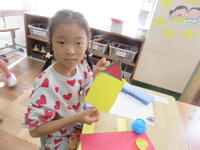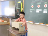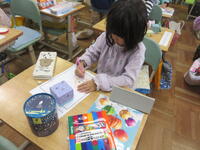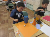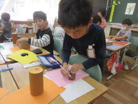 「かたち」の学習をしています。「かたちあて」をしたり、箱などの形をうつして作品を作ったりしました。箱や筒などの形の特徴をよく捉えています。