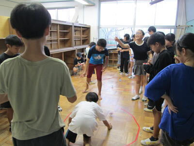 跳びあそびの学習をしています。ちょうど国語では「くじらぐも」の学習をしています。お話の中で1年生、「50センチぐらい」ジャンプをしていましたね。みんなも50センチ跳び越えることができるかな?