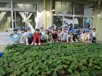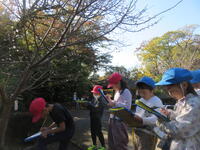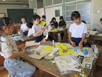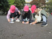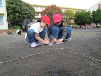 校庭の葉っぱを拾って、こすり出しをしました。同じ種類の葉っぱでも、葉っぱの向きや色を変えると、雰囲気の違う絵になりました。たくさんの発見をした1年生でした。