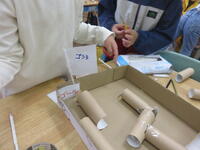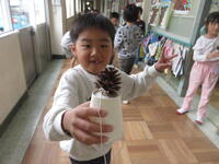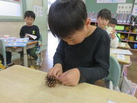 西小学校には立派な松の木があります。その松ぼっくりを使ってけん玉をつくりました。たこ糸で松ぼっくりを結ぶこともできましたよ。