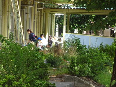 牛乳パックをリサイクルしたり、歯みがきをしたりと水道は混雑しています。