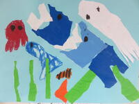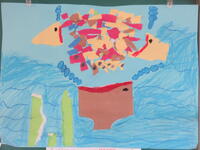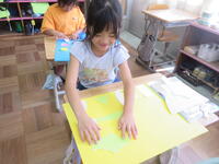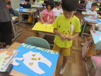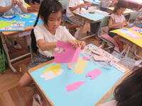今回は「やぶいた かたちから うまれたよ」 です。紙をゆっくり破いてみよう。どんな形になったかな? 向きを変えたら違うものにみえるぞ。並べてみたらもっとおもしろくなったよ。破いて、並べて、貼って、描いて…素敵な作品ができました。
