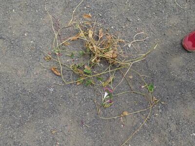 朝顔の支柱を片手に、巻き付いた「ツル」を取っているようです。