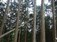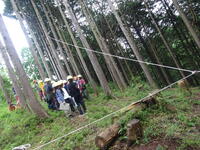 間伐する木が倒れる方向を考えて、ロープが張られていました。