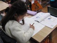 2年生が大きな数の学習をしています。今までブロックを使ってまとまりで考えてきましたので、それが100、1000と大きくなっても子供たちは抵抗なく考えているようです。千を二つ、十を三つ、一を二つ合わせた数の読み方をノートに書いてみようと先生が話すと一斉に書き始めました。真剣に話を聞いています。