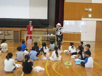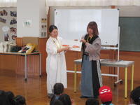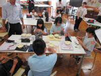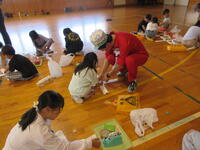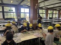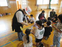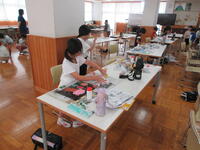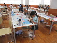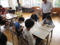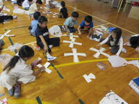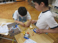 今日は、身近なものを使っておもちゃを作る活動(生活科)の導入でした。そこで、三島市生涯学習センターからおもちゃづくり「名人」と「助手」を招いて、おもちゃづくりの楽しさを伝えていただきました。今日は、牛乳パックやペットボトルのふたなどの身近なものを使って「こま」と「たこでっぽう」を作りました。子供たちは、楽しく工作しながら「もっと作りたい!!」という意欲が増しました。