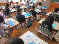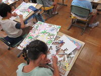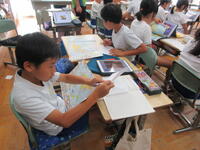 2年生は、とろとろえのぐという学習において、指に直接とろとろ絵の具をつけて絵を描いています。子供たちの豊かな感性を呼び覚ます取組です。子供たちは夢中になって作品作りをしています。