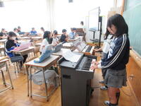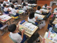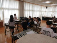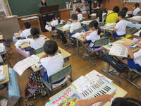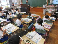 1年生の音楽、けんばんハーモニカの学習の様子です。先生の話をしっかりと聞いて活動する子供たち。先生のピアノに合わせて上手にけんばんハーモニカを演奏することができました。