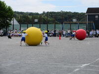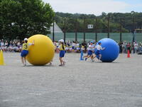 3年「力を合わせてころがせ!大玉!!」自分の背より大きな玉をチームワークで上手にコントロール!