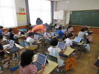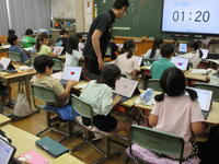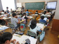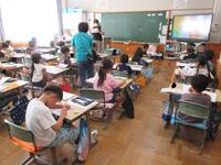 3年生(左写真)は、算数のまとめの問題に取り組んでいました。終わった子供は、さらに自らの力量を高めようと、三島市が導入している「eライブラリ(学習支援ソフト)」を活用して熱心に取り組んでいました。
