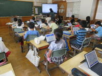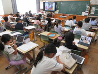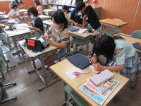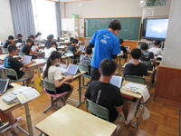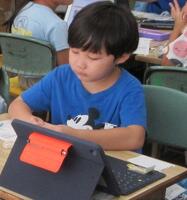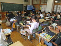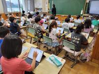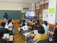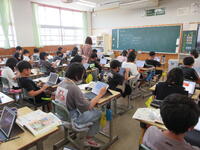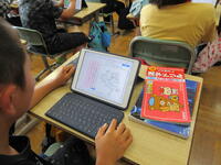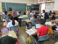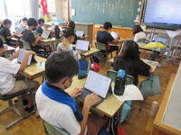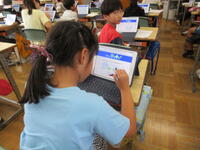 5年生(右写真)は、作文に取り組んでいました。タブレット型端末を効果的に活用して書いていました。手書きより直すこと(文章校正)が容易なので、作業効率がアップしています。