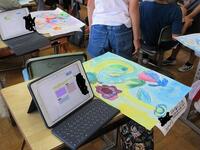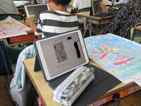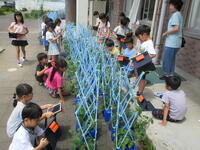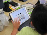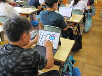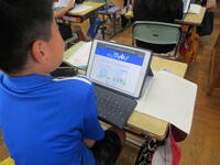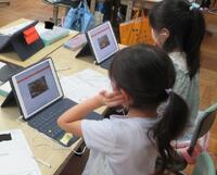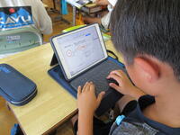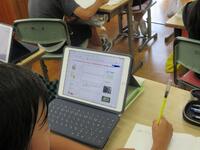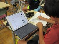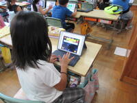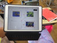 1年生が各自で育てているアサガオの観察を進めていました。タブレット型端末で写真を撮り、その写真をワークシートに貼り付けてアサガオの生長記録にしていました。撮った写真を容易に拡大できるため、「葉」や「つる」の細かなところまでじっくり観察することができます。