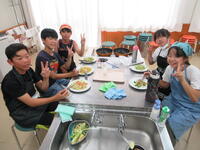 家庭科の授業の調理実習で「ゆで野菜サラダ」をつくります。各グループで材料やレシピなどについて話し合っていました。とても楽しそうに対話しながらの協働的な活動でした。