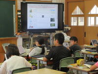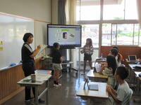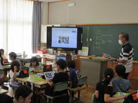 3年生は、担当教員からメタモジ(Meta Moji)に示された4つのお店の写真から、各自わかることを書き込んでいました。それを各班で交流し合い、さらに自分の考えを深めました。最後に、各班毎の発表を、電子黒板やタブレット型端末に映して行いました。授業のはじめから終わりまでの見通しが明確だったため、子供たちの学習意欲が高まりました。
