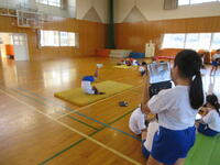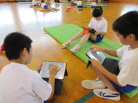 4年生は、自分自身のマット運動の演技をタブレット型端末で撮影し、自己の演技を振り返ったり友達のアドバイスを受けたりして、技の向上を目指して取り組んでいました。タブレット型端末にある振り返りシートに、その撮影した演技画像を貼り付け記録として残していました。とても効果的な取組です。