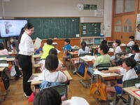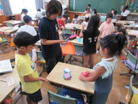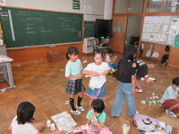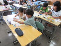 いろいろな食べ物やスポーツを英語で伝えられるように学習していました。2人組になって、学んだ単語を使い、どちらが早くゲットできるか、カルタのようなゲームをしました。子供たちは、わきあいあいとゲームを楽しみながら言葉を学んでいました。