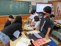 「すずしく過ごす住まい方についてまとめよう」の学習課題の解決に向けて、子供たちは、夢中になって調べながら様々な情報を選択・判断しメタモジ(metamoji)にまとめていました。また、他者参照で友達のまとめ方の工夫も参照しながら、主体的に学習を進めていました。