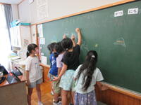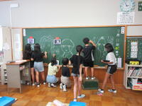 まんがイラストクラブでは、黒板アートに取り組みました。1年生3クラスの教室にある黒板に、1年生が喜ぶ、楽しくなる絵を考えて描きました。4年、5年、6年と学年ごとチームを作り、10分位で構想を練って、30分位で描き上げました。今朝登校した1年生は、にこにこしながら作品を眺めていました。