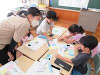 ステンシル版画に取り組んでいて、どのような絵を表そうか子供たちは考えていました。カッターナイフで切り抜くという作業を行うため、どのように紙を残していくかを工夫していました。切った紙がばらばらにならないように頭を使って下絵を描いていました。