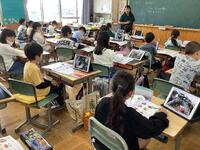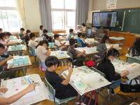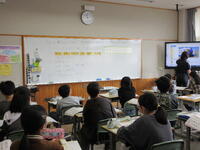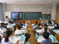 電子黒板の映像に出てくる都道府県はどこかを、クイズ形式で考えていました。地図に載っている特産品のマークなどから、「この県ではないかな」と予想を立てていました。知っている知識を生かして、すばやく「わかった」と声をあげる子もいました。