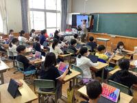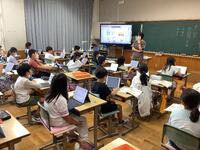 ・右の画像は、タブレット型端末を活用するときの注意点(モラル)について学習している様子です。錦田小には、週に一度「学校DX推進サポーター」が来て支援をしています。その方が授業を見守っていました。