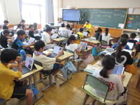 3年生(左写真)は、算数のまとめの問題に取り組んでいました。終わった子供は、さらに自らの力量を高めようと、三島市が導入している「eライブラリ(学習支援ソフト)」を活用して熱心に取り組んでいました。