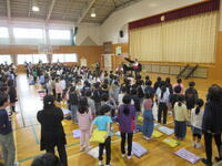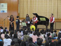 体育館に全校児童が集まって、巡回音楽会を開催しました。今回は、ヴァイオリン、チェロ、クラリネット、ピアノの4人の演奏者によるハンガリーの音楽を聴きました。プロの演奏に直にふれることができる貴重な機会のため、子供たちはじっくりと聴いていました。また、生演奏で校歌を元気よく歌うこともできました。