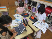 先日の校外学習「三島めぐり」で学んだことを、各グループでタブレット端末の画面を共有しながら、一つの新聞にまとめていました。友達と夢中になって協働的に活動する姿に感心しました。