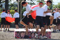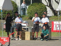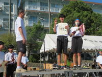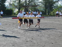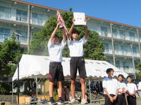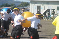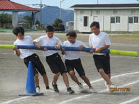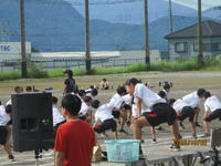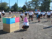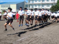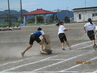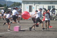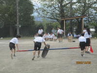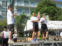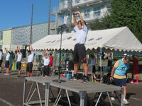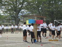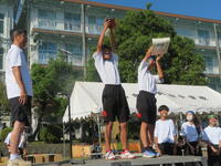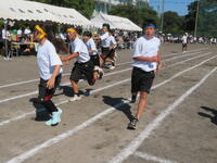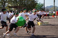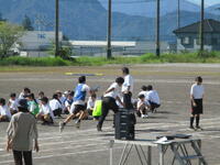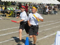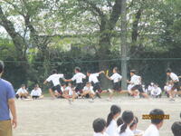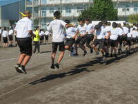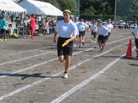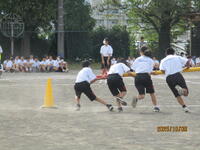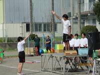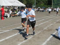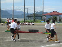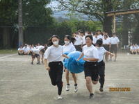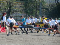 タイヤを使った楽しいリレーです。どのクラスも失敗をくり返しましたが、事故無く荷物を送り届けることができました。担任の先生も生徒に負けないくらい走っていました。ビデオ判定にまでもつれましたが、結果は1組の優勝です。