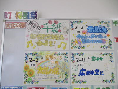 また、2年生の掲示板には各クラスが合唱の部で披露した合唱曲をイメージした