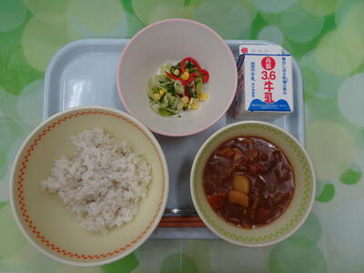 麦ご飯・牛乳・里芋のミートカレー・グリーンサラダ