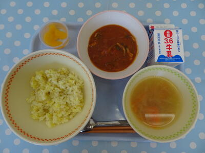 麦ご飯・牛乳・里芋のミートカレー・グリーンサラダ