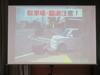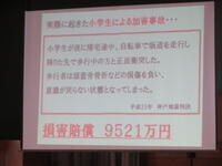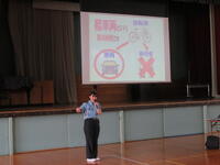 指導員の方は、自転車の正しい乗り方(どこを走るのか、交差点はどう曲がるのか…)について、スライドをで丁寧に説明してくださいました。また、交通事故の例や罰則強化にも触れ、命の大切さを教えてくださいました。