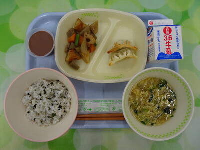 わかめご飯(麦入り)・牛乳・焼き餃子