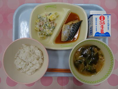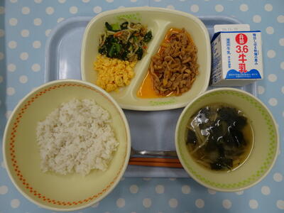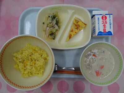 わかめご飯(麦入り)・牛乳・ポテトの卵焼き