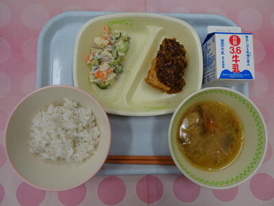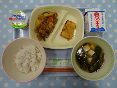 麦入りご飯・牛乳・揚げ出し豆腐の肉味噌あんかけ