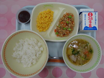 今日はツナの油漬けに大豆、にんじん、枝豆を入れた栄養満点ツナそぼろです。