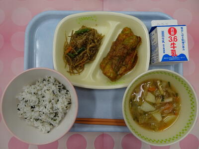 わかめご飯(麦入り)・牛乳・きびなごフライ