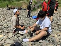 今日の午後は予定を変更し、アジの開き体験、イカの解剖、貝殻ストラップ作り、砂の造形大会を行います。