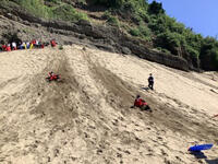サンドスキー体験。傾斜30度の砂の斜面を、そりに乗って滑ります。ゴーグルを装着したら、斜面の上まで上がりますが…なかなかの迫力です!