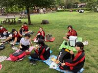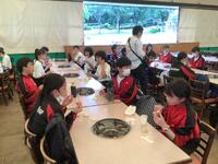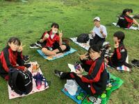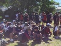 磯の観察が終わり、昼食はおにぎり弁当です。クラスごとまとまって食べています。海風が心地よいです。