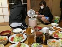 夕食です。海の幸を中心に、豪華なメニューが並びます。ごはんをよそうのも協力です。