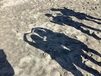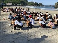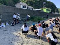 砂の造形大会が始まります。波が高いため、波打ち際に近づかないことを確認しています。力作を期待!