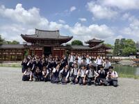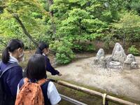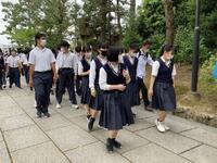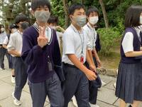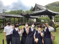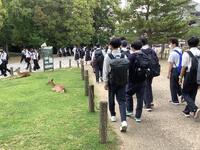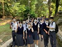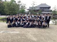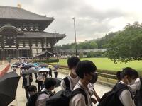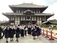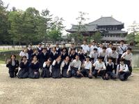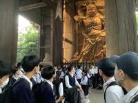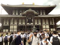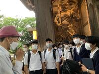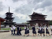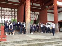薬師寺を見学しました。西塔と東塔を見比べ、その大きさや美しさを感じました。生徒は配布されたガイドイヤホンで、各ガイドからの解説を聞いています。