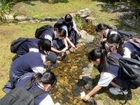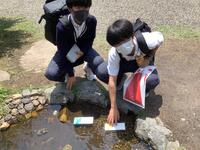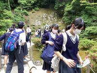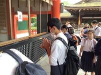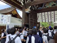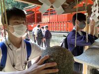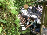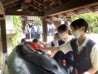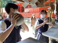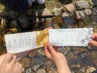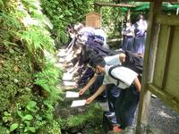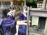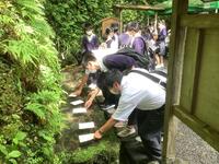 クラス全員で、水占みくじというおみくじを引きました。境内にある御神水に浮かべると吉凶が浮き出るめずらしいみくじです。何グループかに分かれ、浮かべました。「せーの!」結果は…。