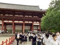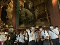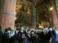 東大寺に到着しました。専門ガイドの解説をガイドイヤホンで聴きながら、大仏を見学しています。このあとは、鹿との戯れも…?