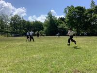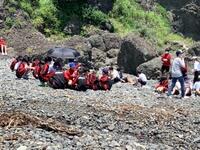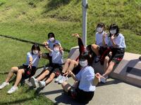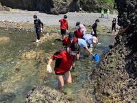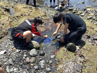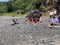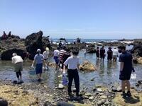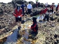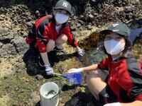 磯の観察が終わり、昼食はおにぎり弁当です。クラスごとまとまって食べています。海風が心地よいです。