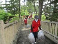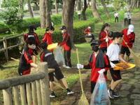 斜面や石畳の間に入っている落ち葉も丁寧にはき出して、ゴミ袋に入れていきます。