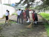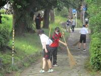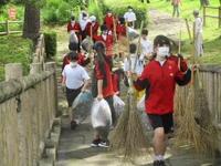前日の雨で、多くの落ち葉が湿っていましたが、生徒は竹ぼうきや熊手を使って一生懸命集めていました。